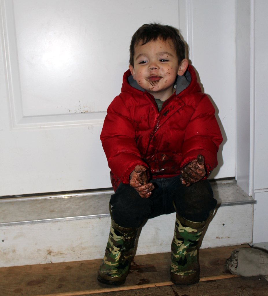 Likes: He loves his preschools, the old toddler group and the "new school" at the Children Museum. He still has his unconditional love of anything with a motor, tractors, trains trucks etc. He loves playing outside with Daddy, getting muddy (see below from this afternoon). He is enchanted with spending time with both sets of Grandparents and all of his cousins. He especially loves his new baby sister!